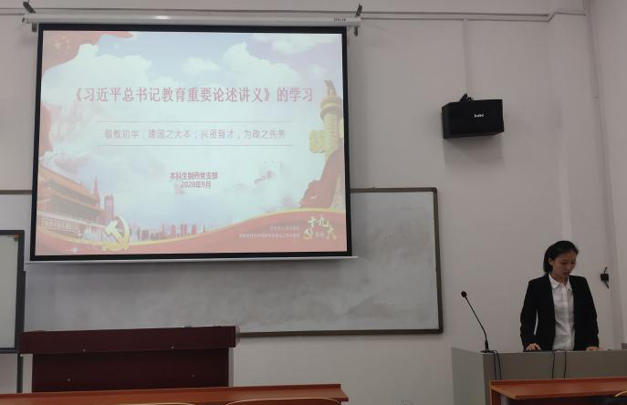 本次主题党日活动由支部党员孙心怡讲解,会议伊始,孙心怡首先为大家讲解了《习近平总书记教育重要论述讲义》的简介以及其编写目的,并鼓励支部的党员同志们积极阅读这本书籍,学习了解习近平总书记关于教育的一些重要论述。