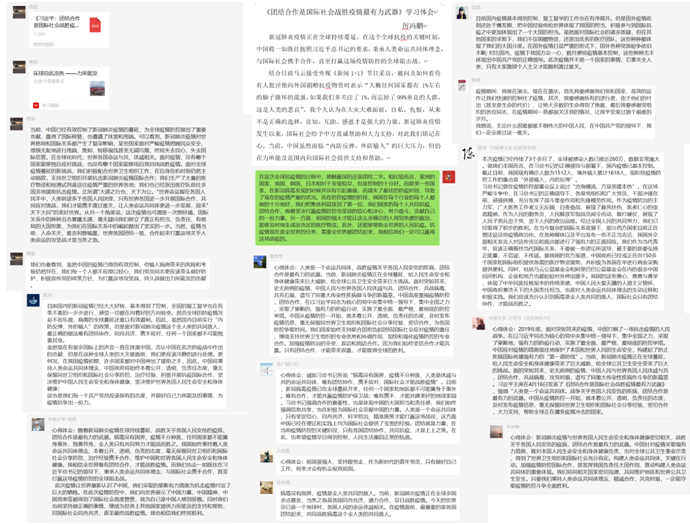 首先,高旭同志会议中带领大家一块学习了中共中央总书记、国家主席、中央军委主席习近平的重要文章《团结合作是国际社会战胜疫情最有力武器》。学习结束后,支部党员大家就这次疫情防疫攻坚战的情况和学习重要讲话的想法发表了各自的看法,会议讨论十分热烈。大家都一致认为,面的突如其来,史无前例的疫情,新冠肺炎疫情与世界各国人民生命安全和身体健康密切相关,战胜关乎各国人民安危的疫病,团结合作是最有力的武器。中国从疫情防控一开始,就本着公开、透明、负责任的态度,及时发布疫情信息,毫无保留同世界卫生组织和国际社会分享经验、密切合作,大力支持、帮助全球正在遭受疫情冲击的国家。构建人类命运共同体,关键在行动。加强疫情防控国际合作,是发挥我国负责任大国作用、推动构建人类命运共同体的重要体现。我们将同相关国家密切沟通,共同维护地区和世界公共卫生安全。只要我们秉持人类命运共同体理念,精诚合作、共克时艰,一定能夺取疫情防控斗争全面胜利。