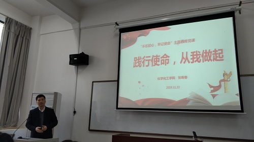 11月22日下午,联系支部的张寿春老师在化学楼123教室为制药和无机化学研究生党支部讲授以“践行使命、从我做起”为主题的党课。