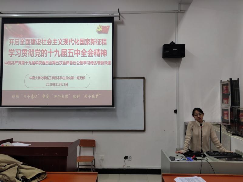 为学习贯彻落实党的十九届五中全会精神,不断增强“四个意识”、坚定“四个自信”、做到“两个维护”,本科生应化第一党支部于11月23日晚在化学楼123教室开展11月份“开启全面建设社会主义现代化国家新征程,学习贯彻党的十九届五中全会精神”主题党日活动。活动由党支部书记于悦凡同志主持,支部全体党员参加学习。