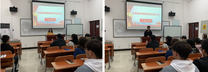 会议第一项支部大会讨论董学莲、莫勇同志接受为预备党员的相关事宜。支部书记张鑫报告出席会议的党员人数,提出会议的议题及具体流程,同时宣布接收同志名单,随后董学莲、莫勇两位同志分别向大家进行阶段汇报,将自己对党的认识、入党动机、本人履历、社会关系及表现等情况进行说明。汇报后,与会党员对发展对象进行提问,并采用无记名投票进行表决。投票结果为:董学莲、莫勇同志赞成票22票,反对票0票,弃权票0票,大会通过了以上2名同志为本支部新预备党员。