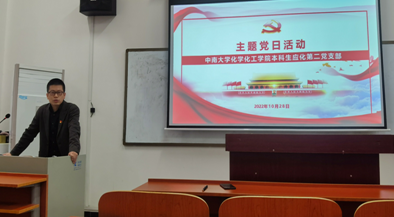 2022年10月28日下午3时,本科生应化第二党支部在开云kaiyun官方网站新校区化学楼124教室开展10月份主题党日活动。活动由支部书记赵元超主持,联系支部的院党委委员李璞参会指导。支部全体党员参加。
