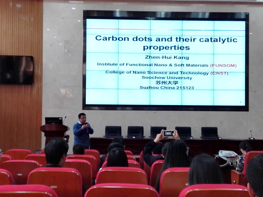4月10日上午10:00,苏州大学康振辉教授应我校纪效波教授之邀在开云kaiyun官方网站新校区化学楼133报告厅举办了题为“碳点的性质与催化应用”的学术讲座。报告人康振辉教授,就职于苏州大学,近年来主要从事量子点催化特性的研究。报告会由纪效波教授主持,来自全校相关学科的师生们聆听了康教授的精彩报告。