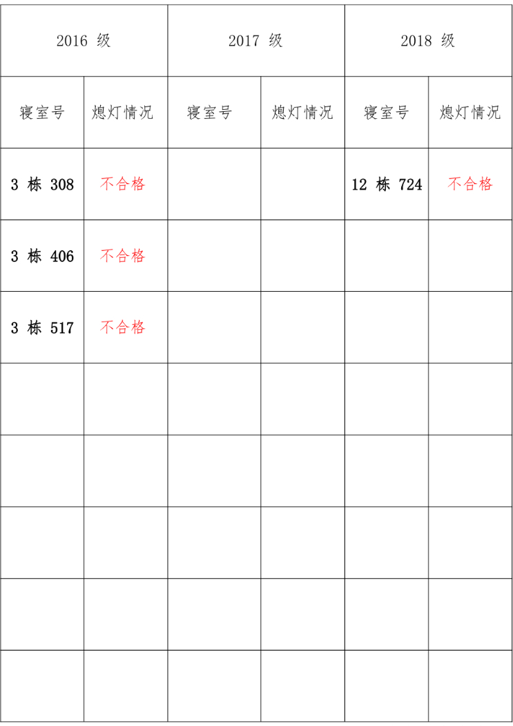为改正各种不良现象和陋习,增强宿舍学习氛围,营造温馨家园氛围,开云kaiyun官方网站学生会生活部对三个年级所有寝室进行熄灯检查。本次熄灯情况通报不合格寝室 4 间,具体情况如下: