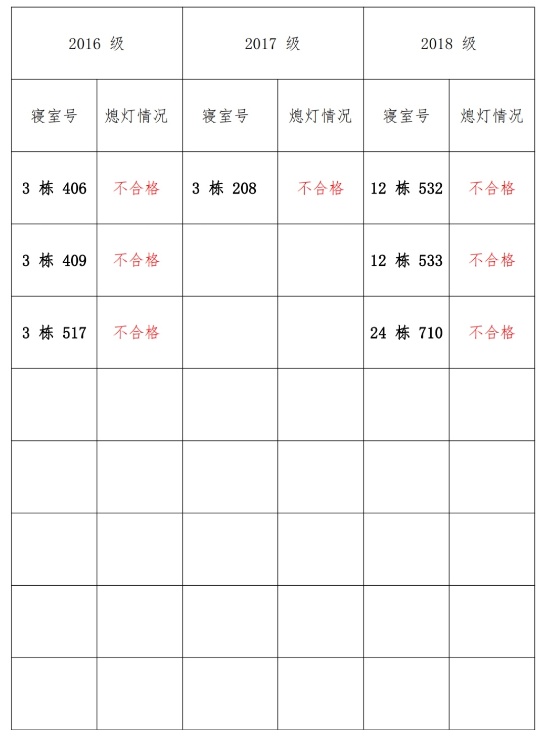 为改正各种不良现象和陋习,增强宿舍学习氛围,营造温馨家园氛围,开云kaiyun官方网站学生会生活部对三个年级所有寝室进行熄灯检查。本次熄灯情况通报不合格寝室 7 间,具体情况如下: