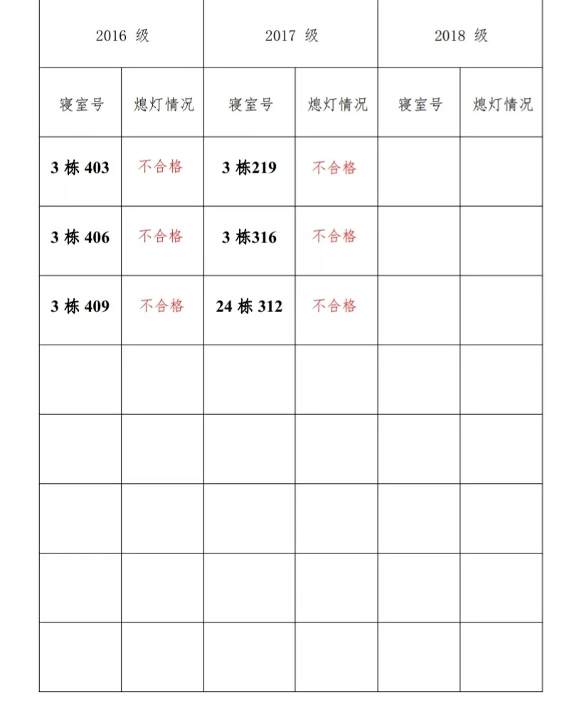 为改正各种不良现象和陋习,增强宿舍学习氛围,营造温馨家园氛围,开云kaiyun官方网站学生会生活部对三个年级所有寝室进行熄灯检查。 本次熄灯情况通报不合格寝室 6 间,具体情况如下: