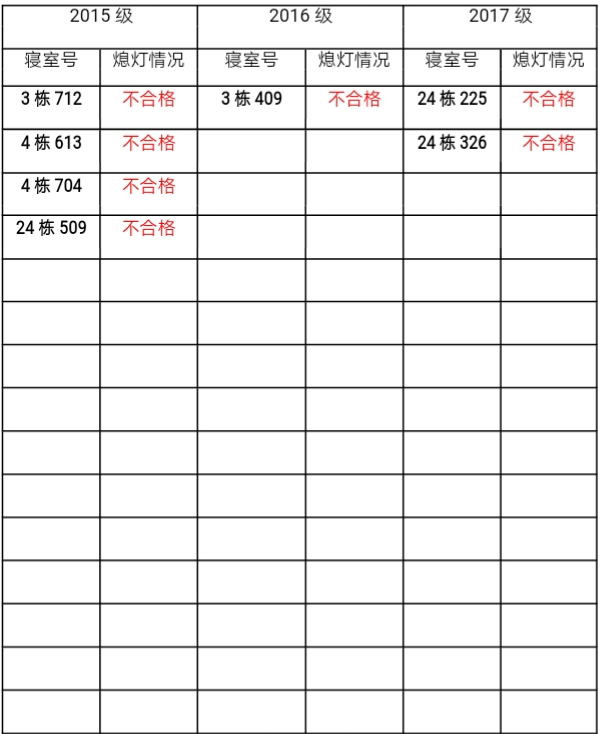 为改正各种不良现象和陋习,增强宿舍学习氛围,营造温馨家园氛围,开云kaiyun官方网站团委学生会生活权益服务部对三个年级所有寝室进行熄灯检查。本次熄灯情况通报不合格寝室 7 间,具体情况如下: